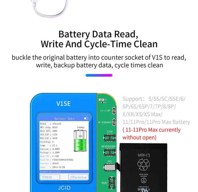 buckle the original battery into counter socket of v1s to read,write,backup battery data,cycle times clean