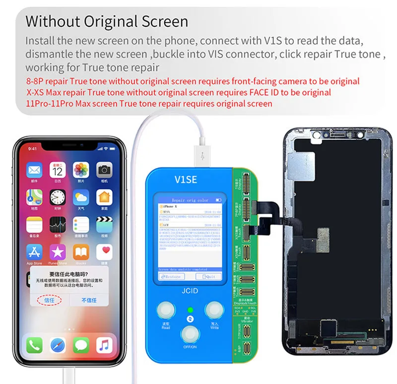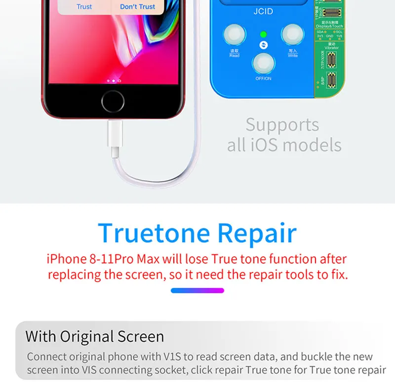 connect original phone with v1s to erad screen data,and buckle the new screen into v1s connecting socket,click repair true tone for true tone repair