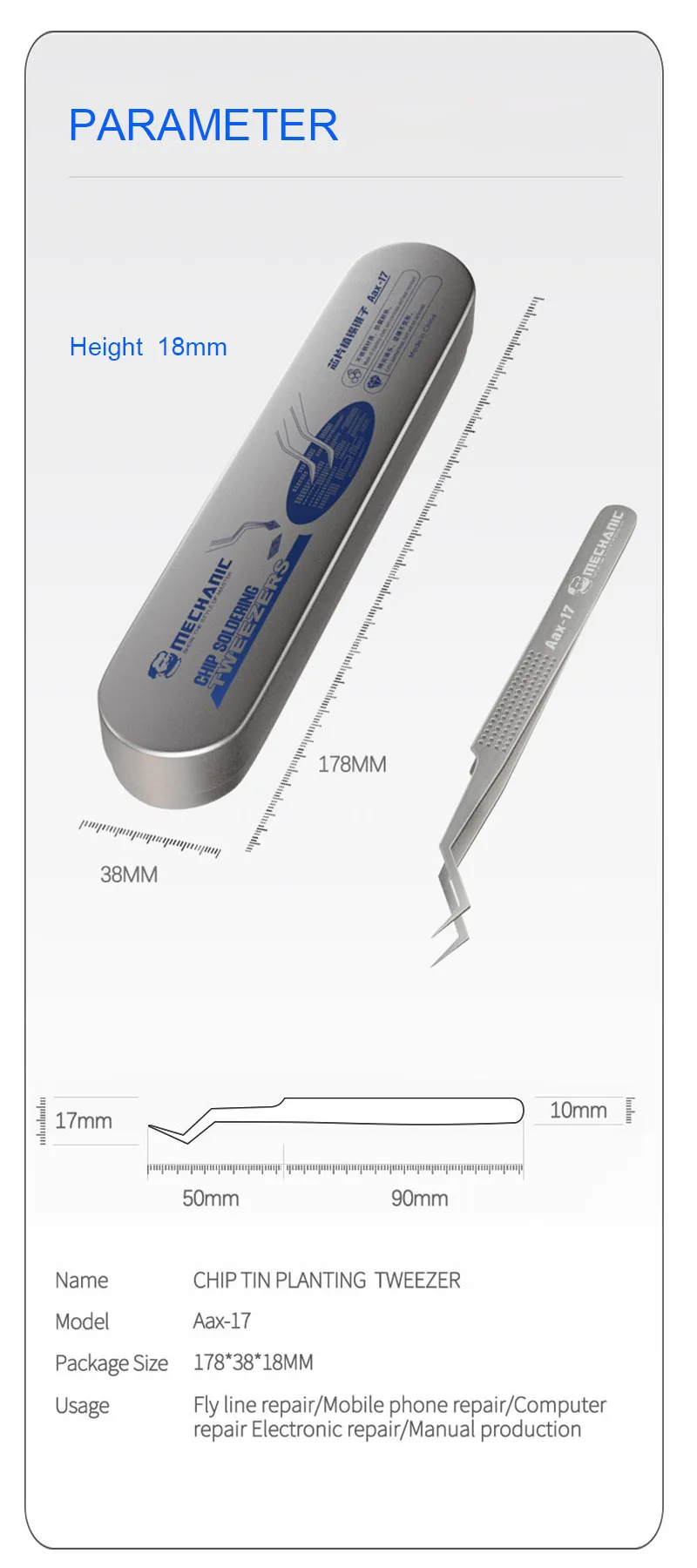Copy| Product Name | MECHANIC Aax-17 Chip Tin Planting Tweezers High Precision Non-Magnetic Stainless Steel PCB Board Repair Soldering IC Chip Clamp |